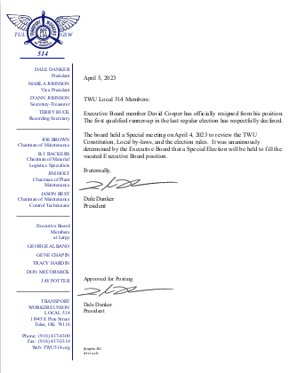 Executive Board member David Cooper has officially resigned from his position. The first qualified runner-up in the last regular election has respectfully declined. The board held a Special meeting on April 4, 2023 to review the TWU Constitution, Local by-laws, and the election rules. It was unanimously determined by the Executive Board that a Special Election will be held to fill the vacated Executive Board position.