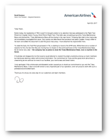 I called AA’s Senior Vice President – Integrated Operations, David Seymour to discuss the letter and he determined that it was a doctored letter. The below attached letters are the doctored letter, original letter with names blacked out and David Seymour’s explanation of what happened and the company’s commitment to the Tulsa base.