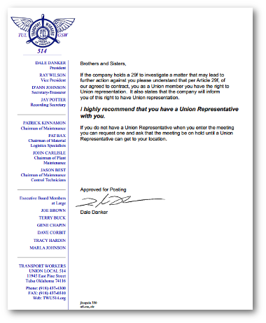 If the company holds a 29f to investigate a matter that may lead to further action against you please understand that per Article 29f, of our agreed to contract, you as a Union member have the right to Union representation. It also states that they company will inform you of this right to have Union representation.