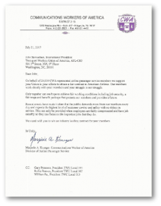 On behalf of 20,000 CWA represented airline passenger service members we support your Union in your efforts to obtain a fair contract at American Airlines Our members work closely with your members and your struggle is our struggle.