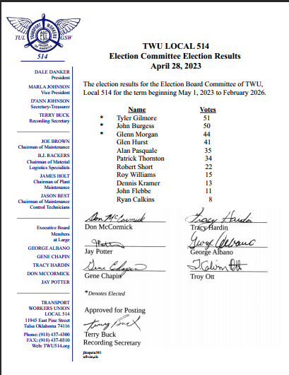 TWU LOCAL 514 Election Committee Election Results April 28, 2023.