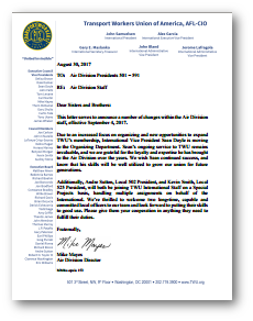 Due to an increased focus on organizing and new opportunities to expand TWU’s membership, International Vice President Sean Doyle is moving to the Organizing Department. Sean’s ongoing service to TWU remains invaluable, and we are grateful for the loyalty and expertise he has brought to the Air Division over the years. We wish Sean continued success, and know that his skills will be well utilized to grow our union for future generations. Additionally, Andre Sutton, Local 502 President, and Kevin Smith, Local 525 President, will both be joining TWU International Staff on a Special Projects basis, handling multiple assignments on behalf of the International. We’re thrilled to welcome two long-time, capable and committed local officers to our team and look forward to putting their skills to good use. Please give them your cooperation in anything they need to fulfill their duties.