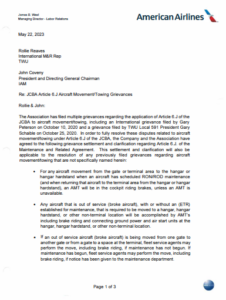The Association has filed multiple grievances regarding the application of Article 6.J of the JCBA to aircraft movement/towing, including an International grievance filed by Gary Peterson on October 10, 2020 and a grievance filed by TWU Local 591 President Gary Schaible on October 25, 2020. In order to fully resolve these disputes related to aircraft movement/towing under Article 6.J of the JCBA, the Company and the Association have agreed to the following grievance settlement and clarification regarding Article 6.J. of the Maintenance and Related Agreement. This settlement and clarification will also be applicable to the resolution of any previously filed grievances regarding aircraft movement/towing that are not specifically named herein: