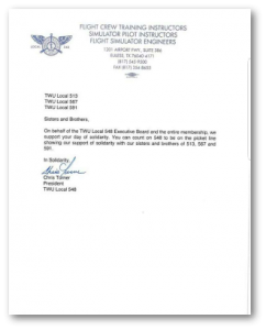 On behalf of the TWU Local 548 Executive Board and the entire membership we support your day of solidarity. You can count on 548 to be on the picket line showing our support of solidarity with our sisters and brothers of 513, 567 and 591.