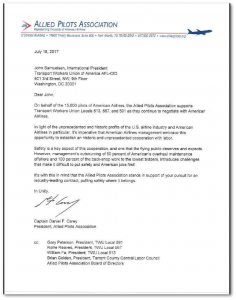 It’s with this in mind that the Allied Pilots Association stands in support of your pursuit for an industry-leading contract, putting safety where it belongs.