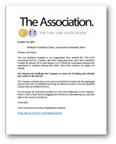 The two mediators assigned to our negotiations have notified the TWU-IAM Association and the Company that three bargaining dates have been scheduled: October 30, January 29-31 and February 12-14. While the Association welcomes the opportunity to negotiate during these dates, these three sessions are simply not enough.