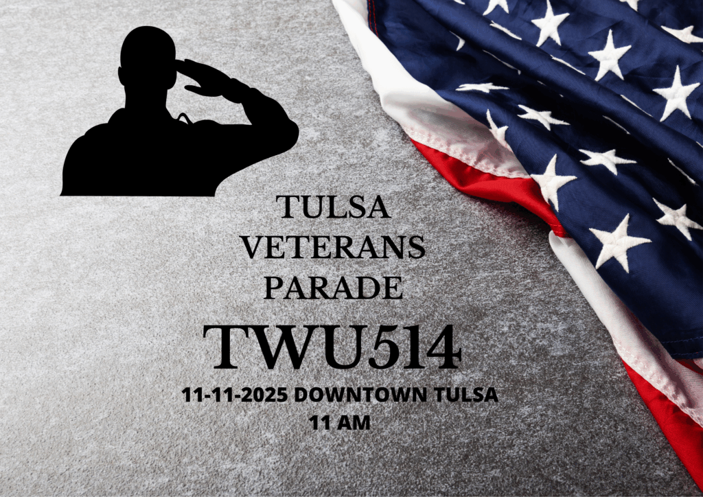 We would like to invite everyone to come join the TWU Local 514 Veterans Committee and participate in the Tulsa Veterans Day Parade on Tuesday November 11th at 11am.