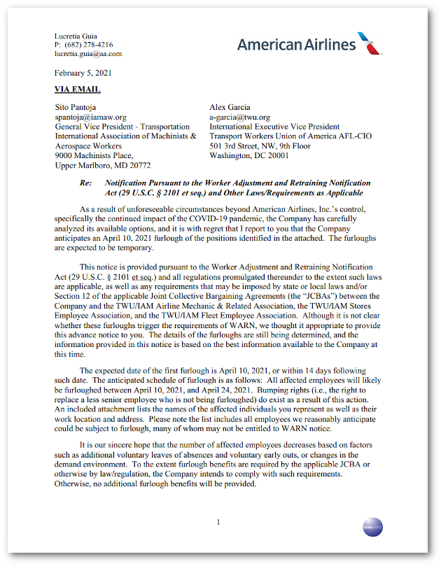 WARN Notification February 2021 February 17, 2021 President Dale Danker shares a quick video on the WARN Notices from American Airlines TWU-IAM AA WARN Notification Fed All States